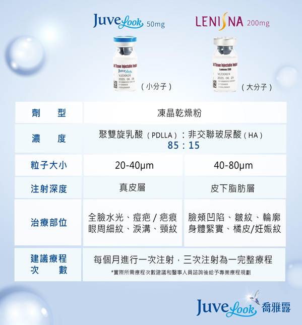 依照不同分子大小與適用情況,推出兩種不同劑型:Juvelook 50mg為小分子劑型與Lenisna 200mg大分子劑型,兩者使用相同濃度之聚雙旋乳酸與玻尿酸結合而成,但兩者的微粒尺寸並不相同。